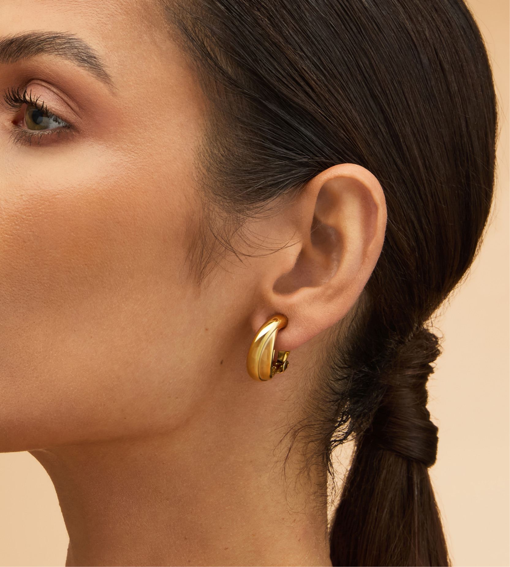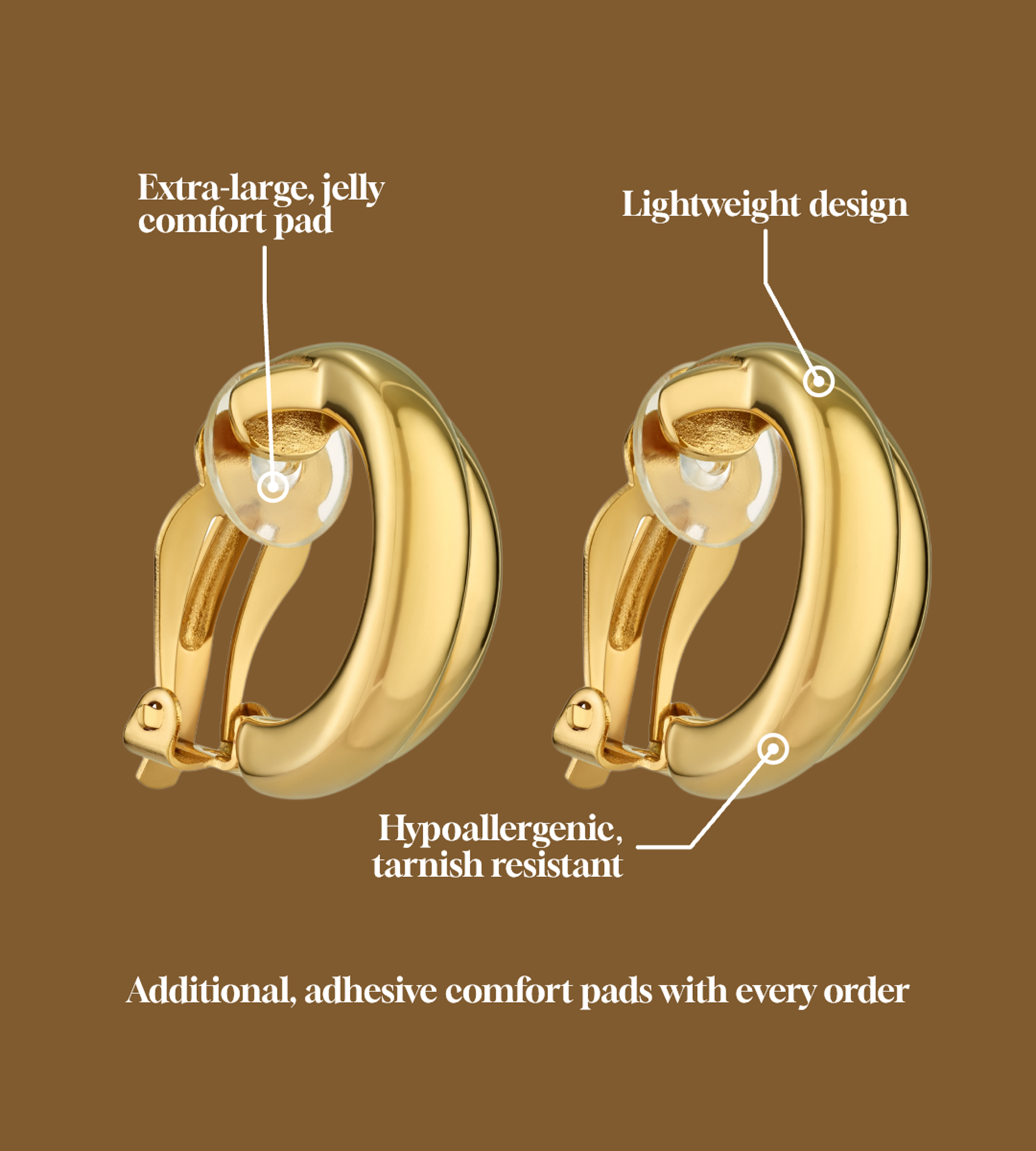 Clip-on earrings specially designed to be extra-lightweight with a secure spring clip. Perfect for non-pierced and sensitive ears, Hugg Earrings uses high-quality, skin-friendly metals and hand-smoothened edges for more comfort. Every order includes complimentary adhesive comfort pads.