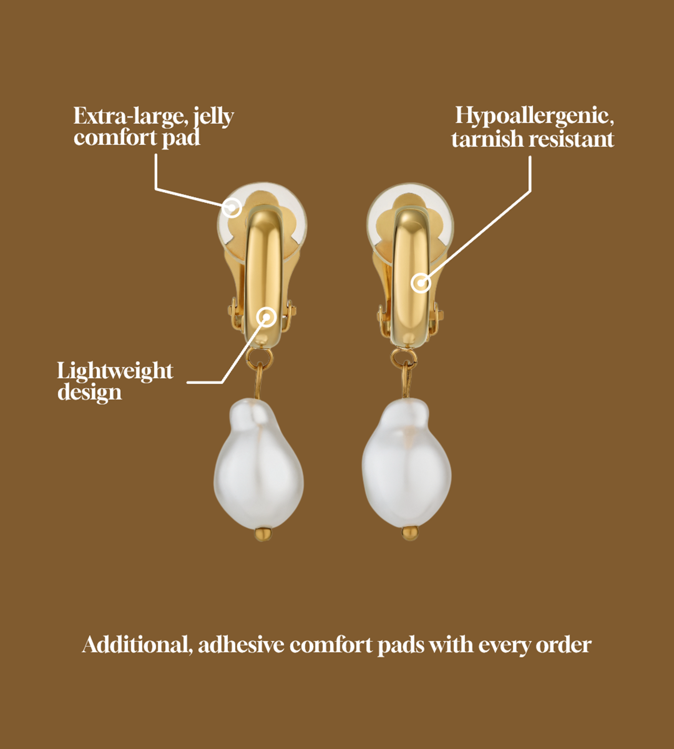 Clip-on earrings specially designed to be extra-lightweight with a secure spring clip. Perfect for non-pierced and sensitive ears, Hugg Earrings uses high-quality, skin-friendly metals and hand-smoothened edges for more comfort. Every order includes complimentary adhesive comfort pads.