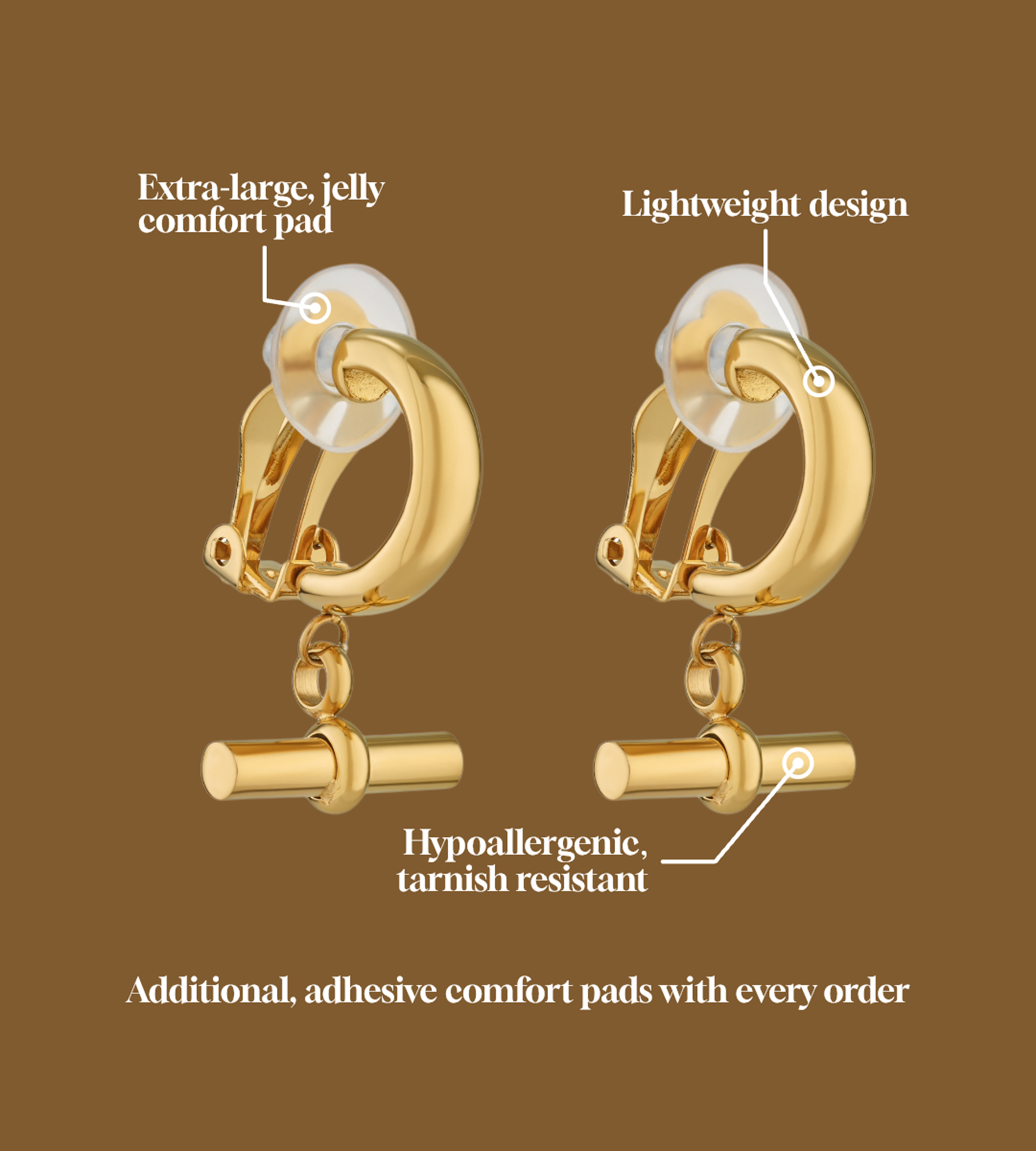 Clip-on earrings specially designed to be extra-lightweight with a secure spring clip. Perfect for non-pierced and sensitive ears, Hugg Earrings uses high-quality, skin-friendly metals and hand-smoothened edges for more comfort. Every order includes complimentary adhesive comfort pads.